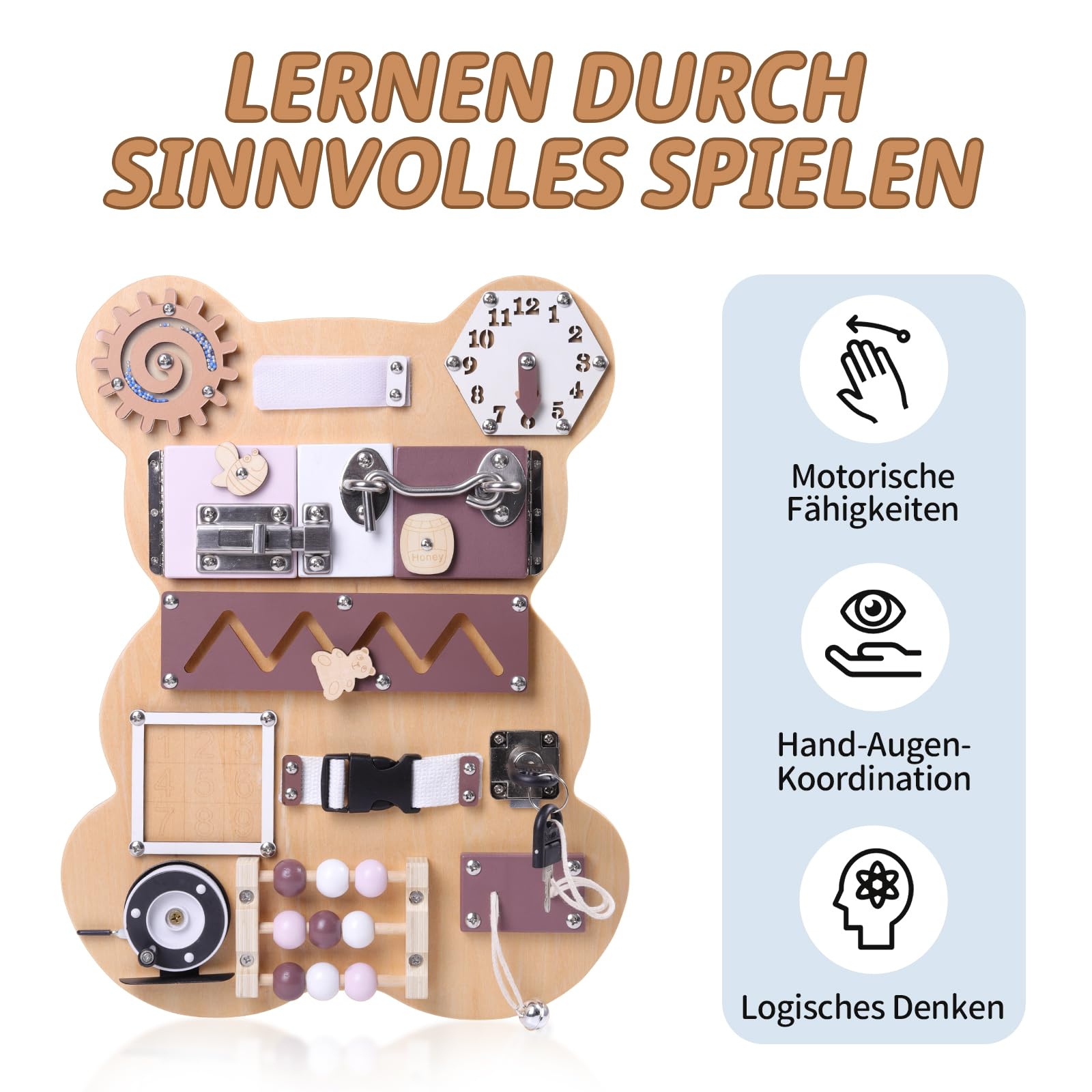 Tableau d'activités Montessori Petit Ours – Jouet en bois pour la motricité fine