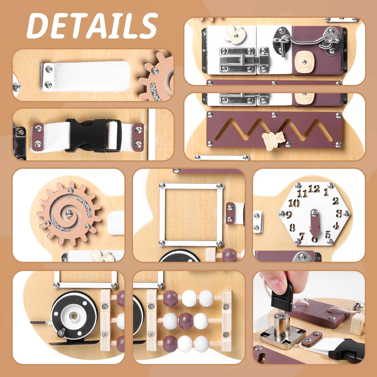 Le tableau d'activités est fabriqué à 100 % en bois non toxique et est traité avec des peintures respectueuses de l'environnement et résistantes à la salive. Il répond à toutes les normes de sécurité et ne présente aucun bord tranchant. Les parents peuvent être assurés que le jouet est exempt de produits chimiques nocifs.